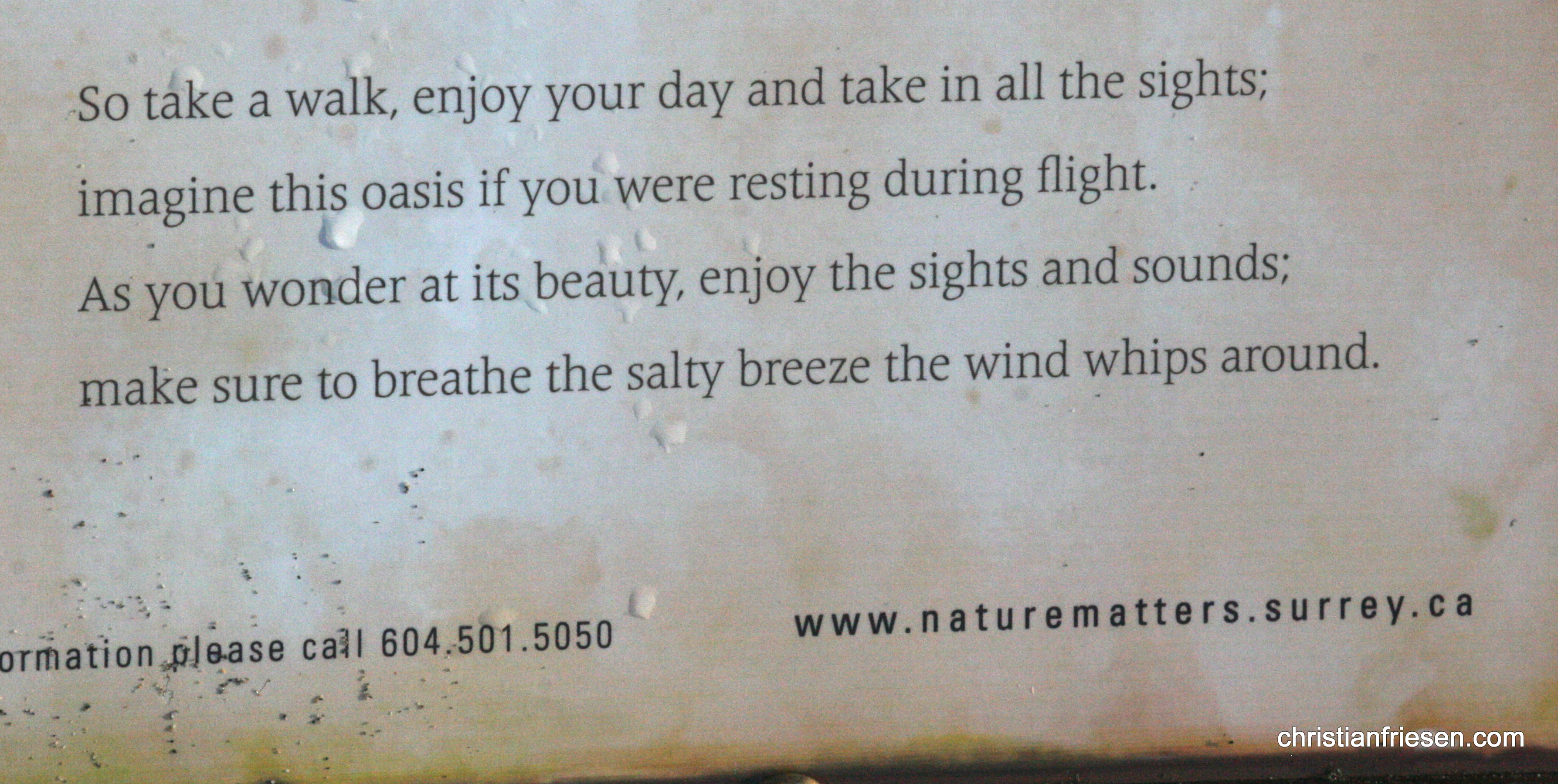 First point: Not sure when the Surrey Parks Board or a Nature Society began to hire poets to write their sign info, but I like it!!