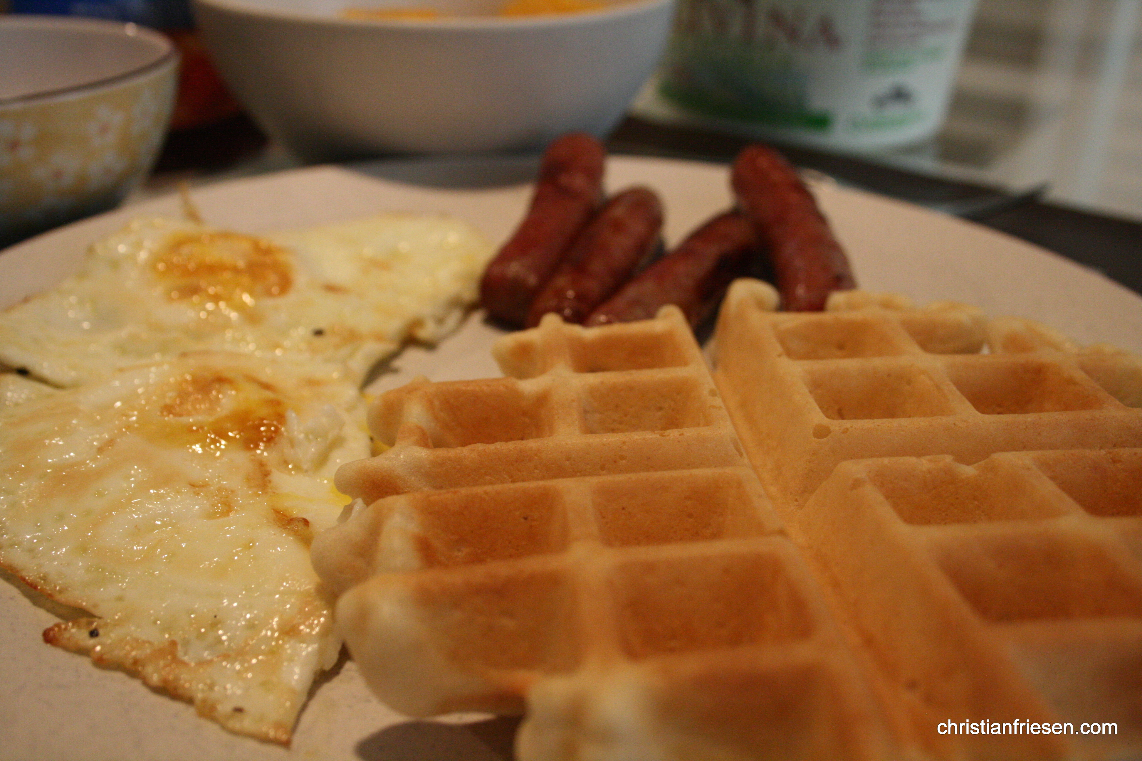 Wow.  This throws my whole family history into a jeopardy.  It could be because of the Mennonite heritage of milking the cows (I’ve never milked a cow but I’ve gathered a lot of eggs and caught a lot of chickens in my day…) and doing chores before breakfast or simply that I tend to be a ‘morning person’, ‘brunch’ has been consumed many many times before 10am in this household.  As the Chief Brunch Maker in this family and for all those who believe brunch can be eaten before 10am, I may add an addendum to that Wikipedia site…